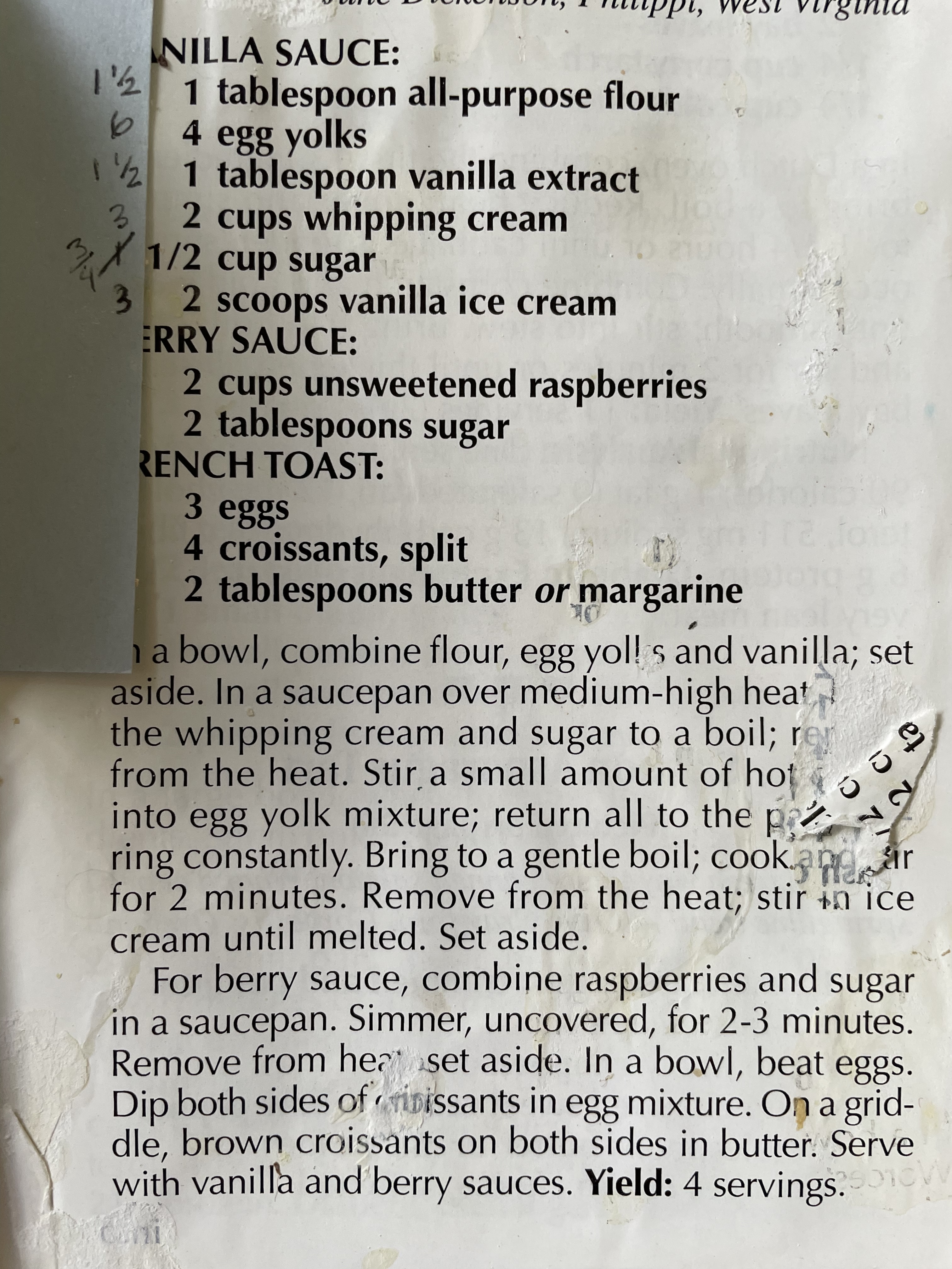 This is the ice cream sauce and raspberry sauce that we put on Croissant French toast. Usually served during the Sunday morning session of General Conference. Makes 4 servings. The original recipe is found here: https://www.tasteofhome.com/recipes/croissant-french-toast/