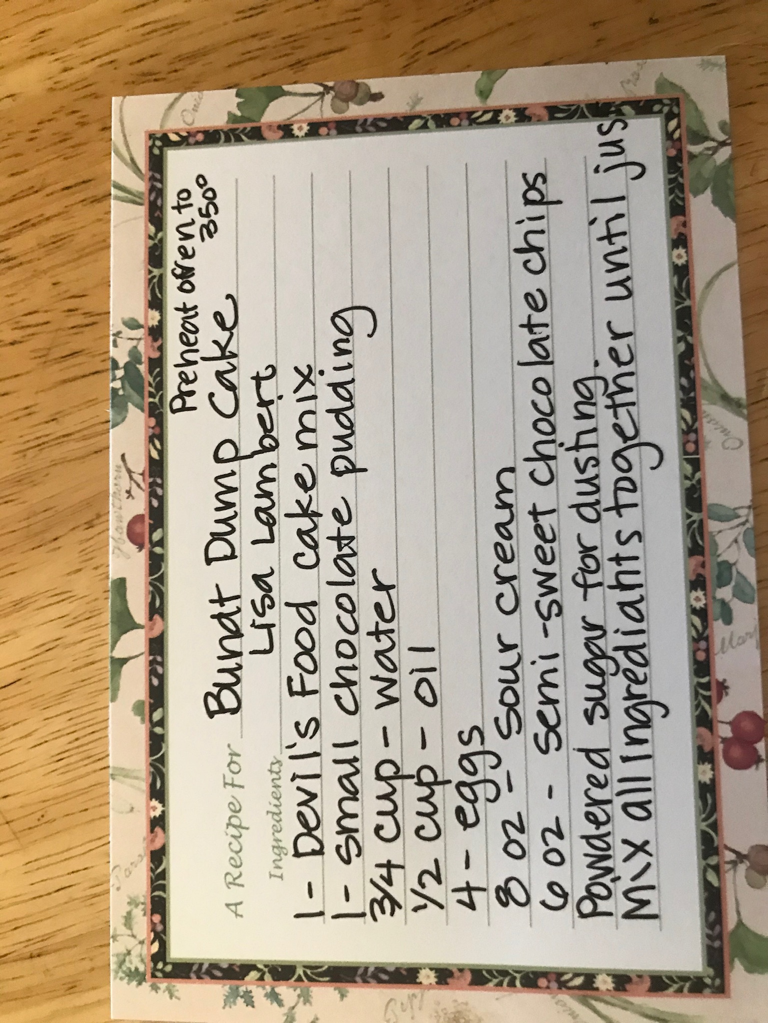 Bake at 350 degrees for 50-60 minutes. The cake is done when a tester comes out clean. Let sit in pan for 10 minutes, then put on a plate. Dust with powdered sugar.